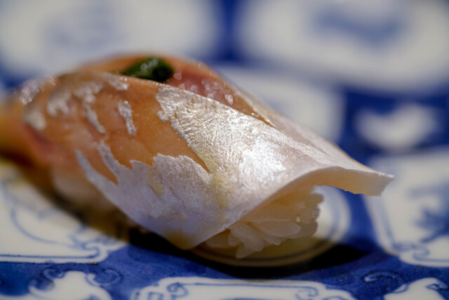 キラっと輝く小鰭、味の重ねも握りも完璧!トントントンと動作もリズムも美しく安定してる。