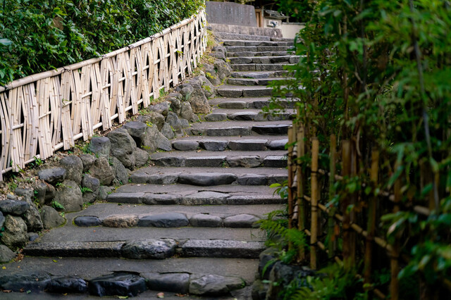 程なく、少し上まで歩くと下る階段があり、灯籠があるお店前へ到着。