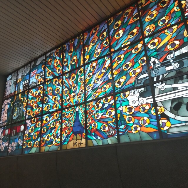 新橋駅の「クジャクが描かれた大きなステンドグラス」