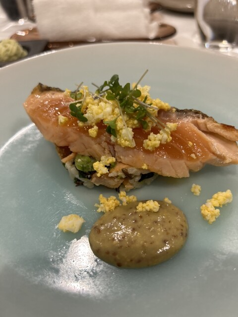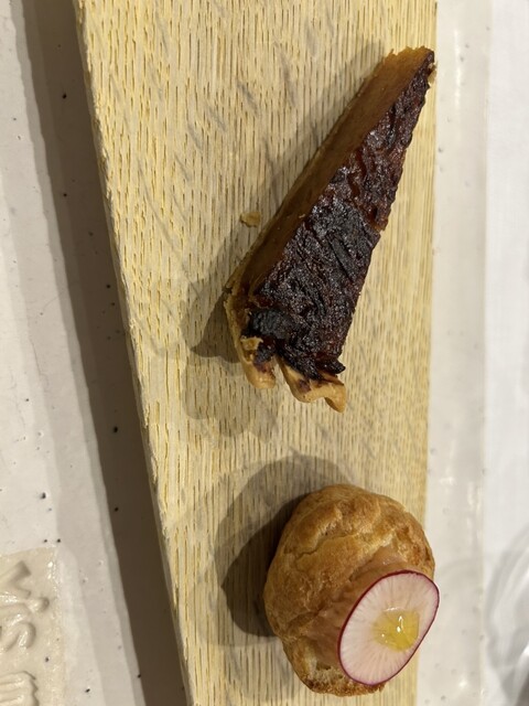 新年が明けて大好きなビマビさんへお邪魔しました。まだお正月の名残がある時期なのでメニューは華やかなものが多かったです。何気に1番楽しみにしているひとくちのお楽しみ、甘く炒めた玉ねぎのタルトとサーモンを使ったプチシュー。マグロのグリエはウドが二手間加えられていて見た目にも美しいです。