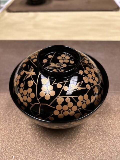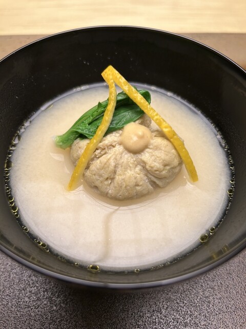 お椀は白味噌仕立てでファグラのおまんじゅうが入っています。全く重くなく、むしろ爽やかに感じます。下には根深どうふの芥子添え