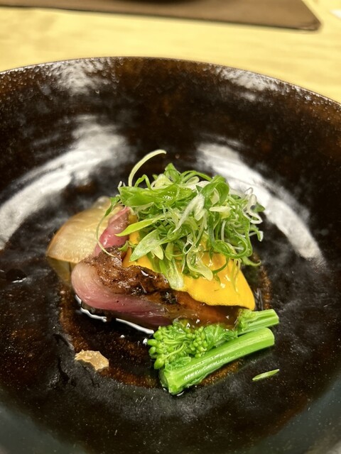 今月のスペシャル料理は九絵と黒鮑 黄韮ソースです。九絵はプリプリで鮑はしっとり柔らかく感動の美味しさです。仙台牛の赤ワインソース 香ばしく炭火で焼かれています。