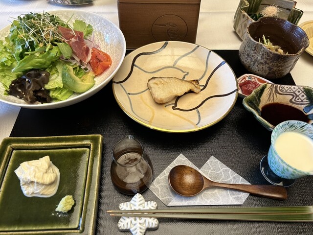 前の晩に選択したお目覚めのお水をいただいてすっきりしたあと、朝ごはんの準備をしていただきました。たくさんの新鮮な野菜サラダを中心に鶏肉 生麩のほうとう焼き サワラの塩焼き しじみの味噌汁 茶碗蒸しにはエビ団子、鰻が入って朝から豪華です。鍋で炊いたご飯は本日は山形のつや姫とのことでした。ご飯がすすみます!完食させていただき、お腹ははち切れそうでした。それでも甘味の白玉ぜんざいとゼリーは別腹で頂きました。次回また間を置かずに伺いたいと思います。