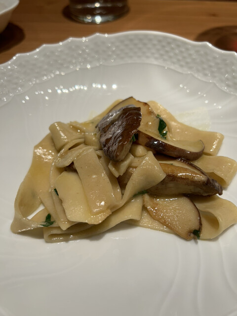 前回お邪魔してとても気に入り、次の予約を取って帰りました。そしてまちにまった再訪門です。シェフと奥様に笑顔で迎えられてホスピタリティを感じました。全員が揃ったところで本日の食材のプレゼンテーションがありました。猪のサラミ、フランス産の生ハム、北海道産の雲丹、大きな松茸とポルチーニ、天然のししゃも、そして楽しみにしていたパスタの種類をシェフから聞き、気分が上がりました。