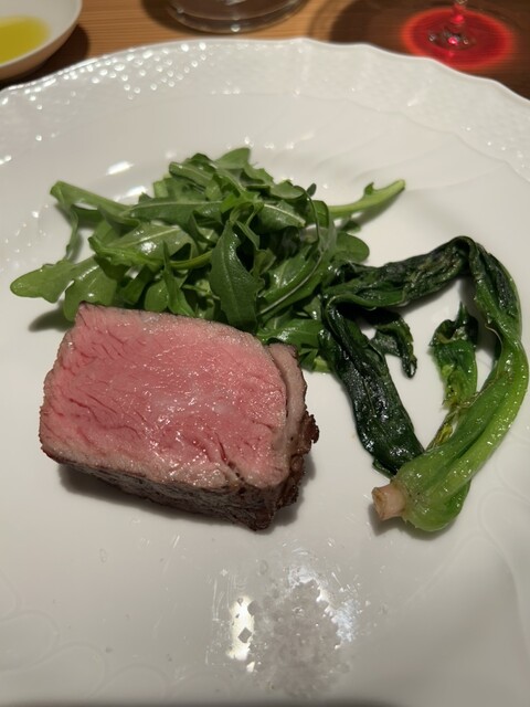 パスタは2種類、イタリアのグリンピースを使ったものとイカと唐墨の手打ちパスタでした。メインは菊池源吾牛 サーロインのロースト、おそらく1番良い状態のお肉を炭火でじっくり焼き上げられています。