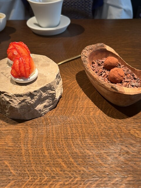 今回のパリの滞在で一 二番に良かったレストランです。日本人女性シェフ神崎千帆さんとご主人のマルチェロ・ディ・ジャコモさんのお店で2019年にミシュラン1星を獲得したお店ということで楽しみに訪れました。明るい雰囲気の店内でアミューズからこの店はとても良いと感じました。お魚 お肉料理とソースが2種類添えられていて、そのうち片方はテーブルでサーブしてくれます。目の前で仕上げられると一層美味しく感じました。ラングスティーヌ(手長海老)のクレソンソースは彩り風味とも素晴らしいです。バスク子牛に添えられているソースも秀逸で、マッシュルームのタルトも土っぽい風味もよく、繊細な感じがしました。イトヨリの焼き加減は絶妙で、今回のお料理で1番美味しかったです。