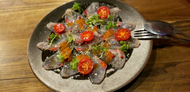 長崎産ヒラマサのカルパッチョと韓国海苔のゼッポリーニ