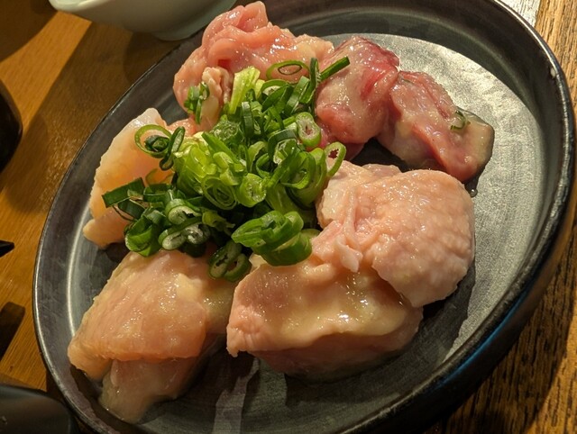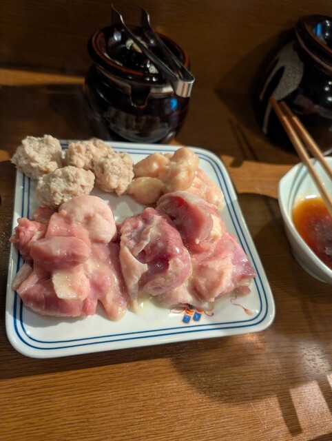 初心者やからはじめに説明してくれはった通りに1品とお酒で鍋が温まるのを待って注文してた盛合せを焼いていくんやけど、この鶏肉が美味しい♪