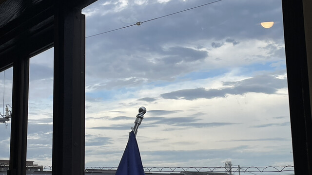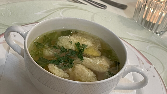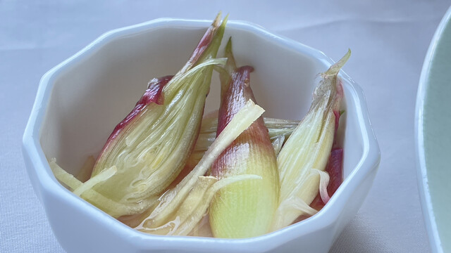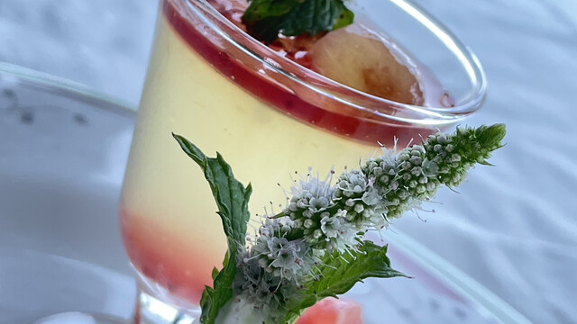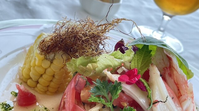 季節のハーブが香る皿に映る季節の空の色を感じつつ飲む