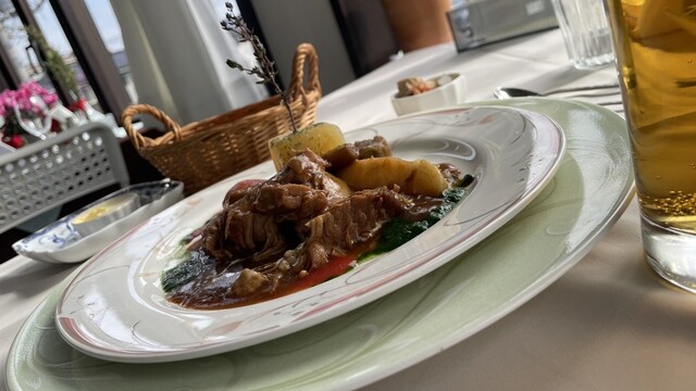 今日はお正月以来のジビエ。煮込まれて露出した柱状節理のような景色を見せる筋肉が自然の荒々しさを思わせる。この旨味の主成分は…イノシン酸かなイノシシだけに。付け合わせの野菜もそれに合わせて荒々しい感じに仕立ててあるとバランスが良いのでは無いかななどと思う。