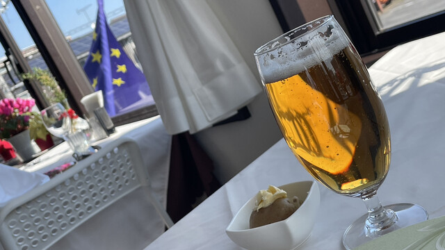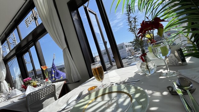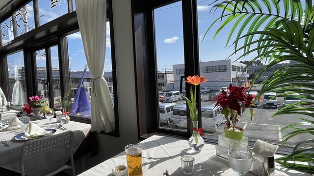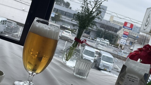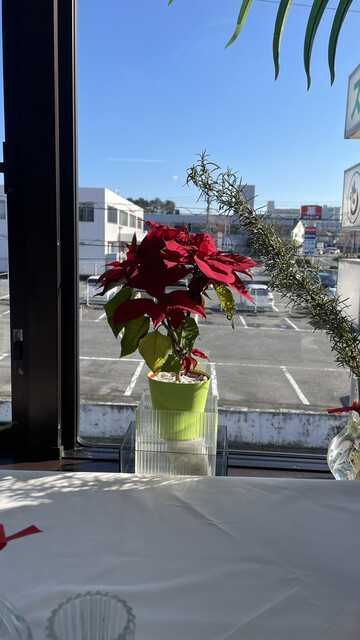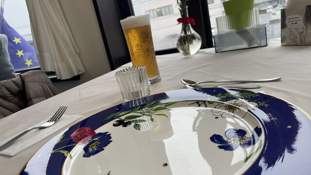 一昨日からスギの花粉が飛び始めて、昼間外を歩くのはちょっと嫌かなとなっていたところ、今日はほぼ飛ばないらしいので安心して外出。ジプロインに向かって歩いてくると建物の向こうに明るい水色の空と雲。テーブルCに座ると窓枠に切り取られたトロピカルな空。やはりここは季節の空を観ながら季節の食材を味わう店だ。