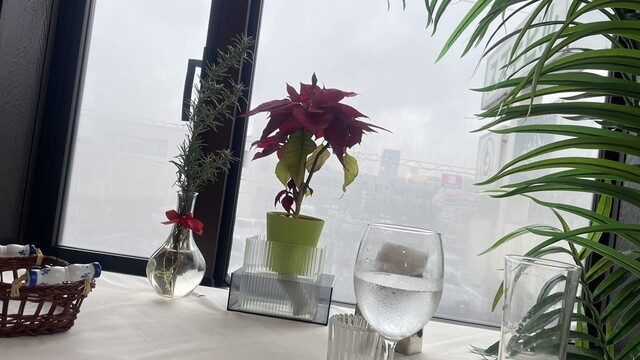 晩秋のこの店の窓際にポインセチアが来てもうじき3ヶ月。少しお疲れ気味な感じになって来た。うちのこたちは、特に窓から遠いのはまだ初々しさもあるので、日に当てすぎると無駄に活動してくたびれてしまうのかも知れない。
