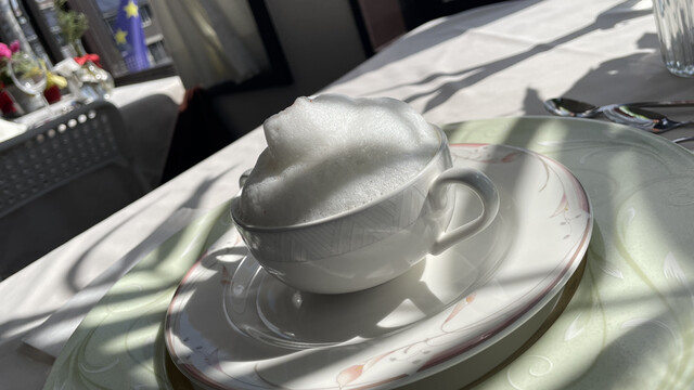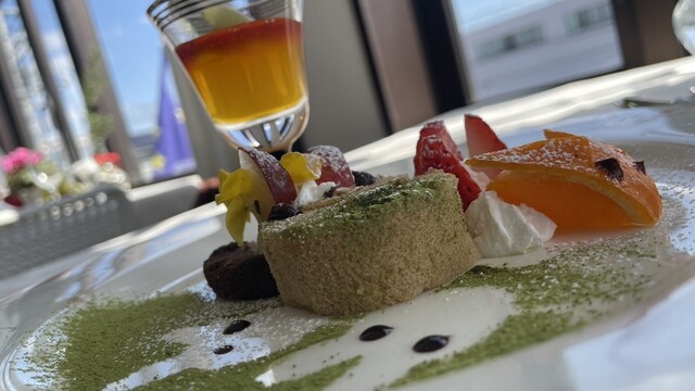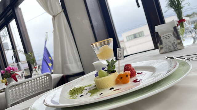 本日も1500円ランチ。雨曇りの空がテーブルをレフ板のように柔らかく照らして、特にスイーツのような料理のディテールをくっきりと浮かび上がらせる。