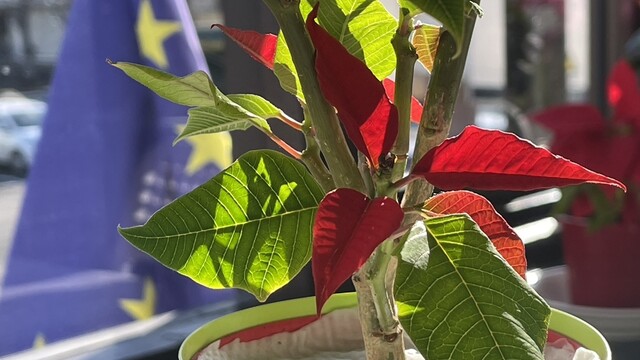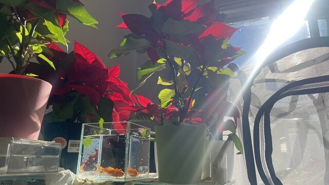 お正月休み中のお店で不可逆的なダメージを受けたポインセチアの代わりが来た。そもそもクリスマスにピークが来るように育てられて来ただろうし、葉っぱの寿命もあるだろうから、下り坂なのは否めない。花も咲き終えて落ちてしまった。新着のポインセチアは実際には前任者より先輩で、2カ月近く室内の日陰で暮らしていた。どうもこの季節、あまり日に当たらない方が成長も老化も緩やかで長持ちするように思われる。そして水面下にはなにやら赤い水生生物^_^。