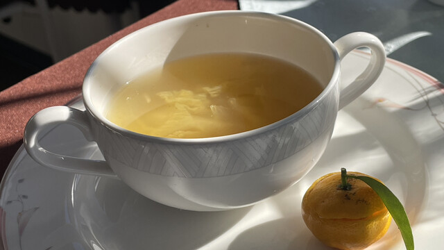 スープに添えられて来た小さいミカンはふくれみかんと言う、つくばの特産のものだそう。スープに絞ってみると、ゆずのように強烈ではなく、みかんのように甘ったるくなく、控えめの香りと酸味。クセが無さすぎる感じもするけど、タネの周囲には独特の味を感じた。