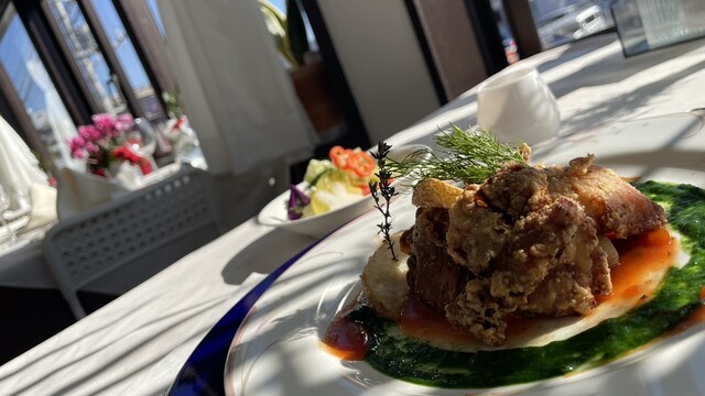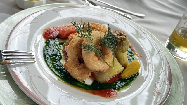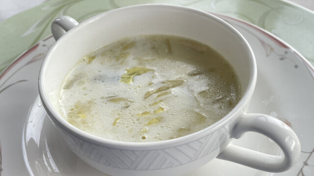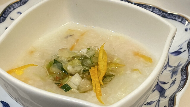 スープの淡雪仕立て。これは泡で断熱して保温性を高めているに違いない。淡雪に隠れてヤマイモの輪切り的なものが入っていたけど、え?と思った時には喉を通過してしまっていた。