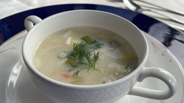 里芋大好き!ごぼう大好き!こんにゃく!自分が好きな食材は大抵、食物繊維が豊富だ。物心ついた頃からねっとり系が好きなので当然とも言える。これは日本のけんちん汁と違って、油が油揚由来ではなく、スープが醤油ベースでなく、バケットとディルが載っている。けんちん汁のように濃厚で具沢山だけど、煮込んだ感じとか雑味とか臭いがなくスッキリしている。ただもちょっと洋風に寄せた方が面白いような気がする。なんか足すとしたら… レタスとトマトとか^_^。