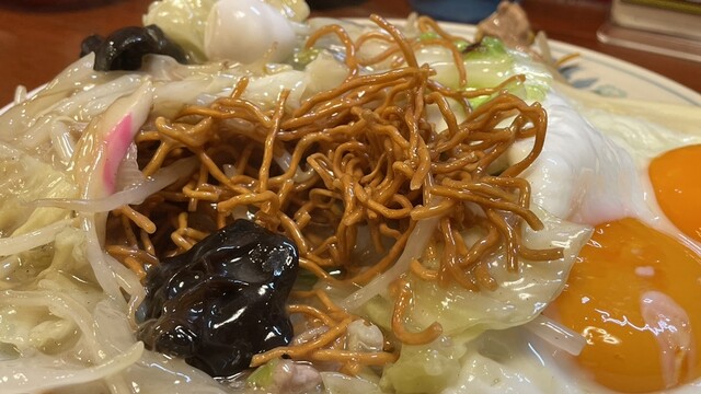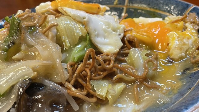 かた焼きそばの麺が大元らしい細麺でパリパリしていてとてもよかった。アルキメンデス^_^