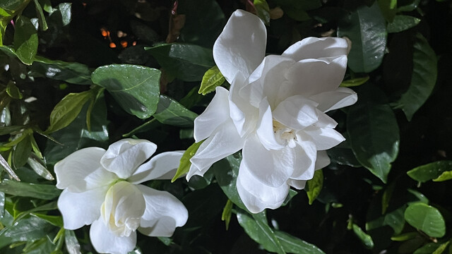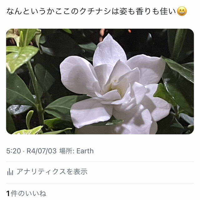 大元の2024年版クチナシの花が咲き始めた。昨日通りかかった時に一輪開いているのを見たけど、今日は数輪に増えていた。ここのバラ咲きの儚げな青白いクチナシは夜、照明に照らされて陰影を帯びて浮かび上がってるのがとても美しく見える。そしてこのやや病弱系なジャスミンの香りをクンクン^_^。