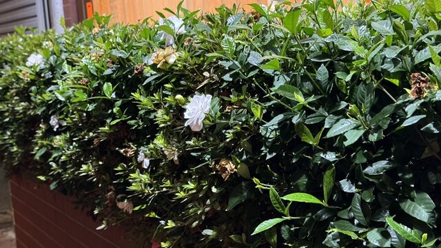 自分が育った環境にはクチナシは無かった。いや、あったのかも知れないけど、どう言う花か知らなかった。渡哲也の歌で名前を知る事になって、何やらイメージが膨らんだけど具体的にはわからなかった。今では指輪も回るほど♪。初めてああこれかと認識したのは大人になってガーデニングにハマった時だった。その透き通りながら輝くような白さと翳りを帯びたジャスミンの香りと日陰でも健気に育つ様を見て、なるほど歌の通りだなと思った。この店の生垣がクチナシだと気づいたのは、それからさらに20年くらい後の事だった。