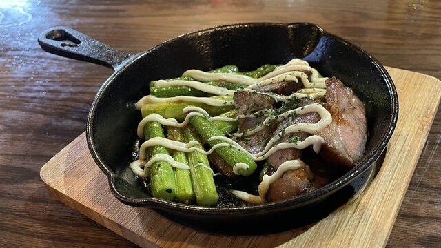 ここの自家製ベーコンはもともと独特な味わいがあるけど、今日は炙ってあって面白いカリカリ食感とカラメルっぽい風味が加わり、それがプリプリでジューシーなアスパラと合わさってシナジー^_^とても美味しい。