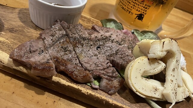 連日ではどうかなと思ったけど1000円サーロインがあったので注文。してみたら、昨日はサラダ仕立てでドレッシングの味が勝ってたけど今日は黒胡椒のみ。より牛肉そものの味と香りが楽しめる。同じく素焼きのたけのこ…移り香なのか嗅覚の錯覚なのか焼き鳥と似た香りを感じる。白い柱状節理の食感が、もしそういうものがあればクリスピーなホタテの一夜干しのようだ。焼いたクリとかとうもろこしとも似た香りがする。たけのこのえぐみは感じないのに、独特の美味しさは強く感じる。大衆酒場の酒の肴じゃ無い、グルメレポートのようになってしまう^_^。しかしもしこれが採算に乗っているなら、定食屋さんとして大繁盛も間違いない。まあ最近、ファミレスであんひりーばぼーなサーロインを食ってしまった悪夢が冷めやらぬ中でもあり、相対評価として。