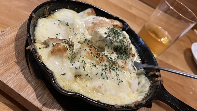 連日ではどうかなと思ったけど、今日もジャガイモのチーズ焼きがあったので注文。今日はエビが入ってる分なのか少し高い。えびは当たり前に美味いけど、焦げたジャガイモの皮の香りと味がそれを凌駕している。流通過程のための保存のためにいじくり回されて失われる本来の美味しさと香り、付加されるコストが無い。
