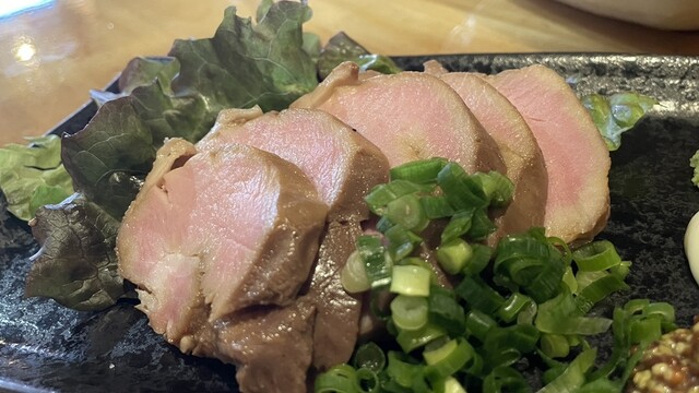1000円でサーロインのサラダというのがおすすめにあったので、あまり期待しないで注文したところ…薄切りではあるものの立派にサーロインステーキのジューシーなミディアム。大好きなサニーレタスがどっさり。この店の肴は微妙に高いなーと思う事が多いけど、これはびっくりなお値段以上^_^。生魚の状態の管理と、焼き鳥の焼き加減に気を使う焼きものやが、牛肉を焼いたという感じ。