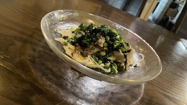 この店の本日のおすすめで最初の頃にへえと思って記憶に残って居るのが、2年半前の冬に登場したホタテのガリわさび和えだった。ガリがもたらす柔らかい酸味と、茎ワサビの柔らかいワサビ味、ややへこたれて味が出たホタテの、モヤっと力の抜けたコンビネーションがとても良かったと思う。その後、ホタテときゅうりとゴマと言うメリハリのある味のメニューは頻繁に登場しだけど、あのぼんやりトリオは見たことない。今日はガリわさび和えとメニューにあったのでおおぅと思ったけど、ワサビの味も香りも検出出来ないので、勢いでメニューを書き間違えたか、ワサビを入れ忘れたかというミスが疑われる^_^。