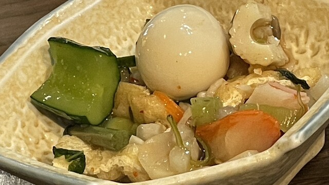 久しぶりに少し寒い感じもしたので、本日のおすすめから海鮮揚げ出し豆腐と言うのと、アサリと水餃子の旨辛チゲ風を選択… どちらもイマイチな感じがしたので、生卵を頼んでミックスしてみたらそこそこいい感じに。和韓折衷というか強制併合と言うか^_^。
