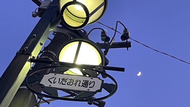先一昨年の秋分の頃に筑波山に登った時、ロープウェイ駅のある女体山からケーブルカー駅のある男体山に険しい稜線の道をこけつまろびつやっとこ渡り終えて東を振り返ったとき、日没の迫る青空に浮かぶ白い月を見た。それがとても印象的だったのが、月を観るようになったきっかけだった。それ以来、やたら望遠鏡やらカメラやら買い込んで、月が出ている日にはほとんど毎日月を観ていた。現代人が月を観る楽しみと言うのは、なんか無理してる風流とかではなく、ただ単に美しいし、昔の歌人が知らなかった地球の生物に大きな影響を与えて来た天体という重みを知っているから。それに昼間の青空の月は目にやさしく、スマホのカメラにも易しい。慶にはハッピーアワーに間に合うようにまだ空が明るく青いうちに来る事が多い。そのために青空に浮かぶ月を観る機会が多い。だから三日月から上弦過ぎくらいまでの、夕方のくいだおれに誘うような月と慶は自分的にはセットになっている。