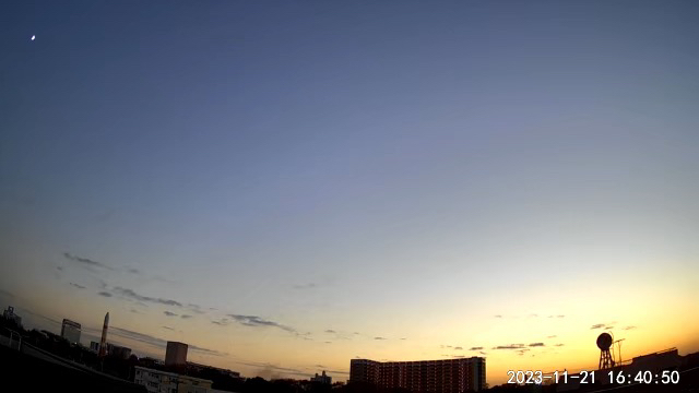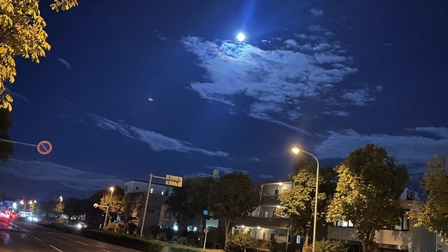 くいだおれ通りに昇る月。昨日満月だった月は今日は右側から少し欠けてるはずだけど、肉眼ではまん丸に見える。