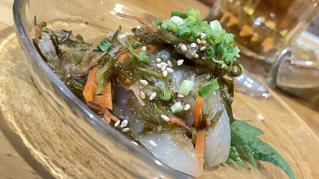 刺し盛りの下敷きになって居たこれが美味しくて、これは何ですかとケータさんに聞くと、海ぶどうだそう。そういえば昔他で食べた事あるけど、美味しいと思った記憶は無い。これ、ピンで主役で、売れると思う。