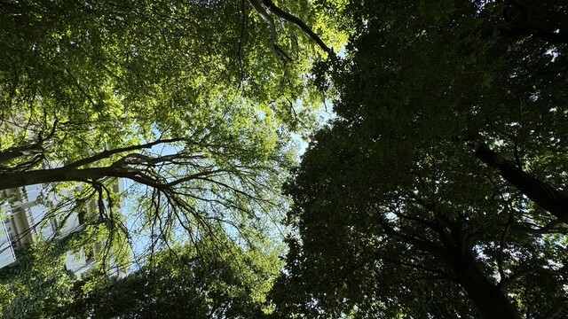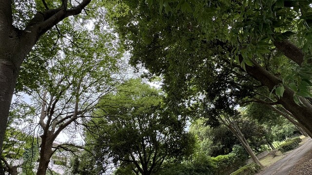食後に林に来てみると涼しい風が吹き抜ける鋪道の石畳の目地に蝉の声が沁み入っていた^_^。ウグイスはギブアップしたのか鳴いていない。ケヤキの枝で涼むカラス1匹。30分ほどしてうんちをしてひと鳴きして飛び立ったので自分も引き上げる。