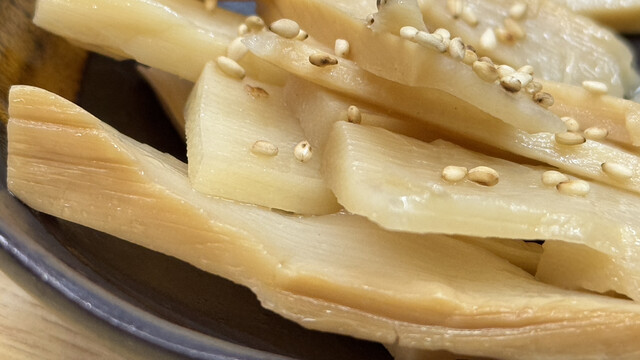 昔はシナチクと呼ばれていた。メンマにはなんか知らないけどふやけたグニョットして白いアスパラみたいな臭いがするやつと言うイメージがあってあんまり食べたいような食べ物でも無かったけど、ちょっと前にここで食べたら美味しい感じがしたので再注文。ザーサイのようななかなかしっかりした歯ごたえで味もいい感じ。マスターと、竹を食べるだなんて中国人の発想はすごいよね、パンダの仲間かよ、でもこれで食糧危機もへっちゃらだ、なんて話をしながら。