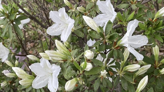 店と植物園の間の道路脇、コブシの向かいでは貧相なツツジの低木が満開。子供の頃から、ツツジとか生垣にわっと咲くやつってイメージでありがたいものとは思ってなかった。最近になって、一輪一輪を観るとなんとも味わいの深い繊細な姿形をしている事がわかった。