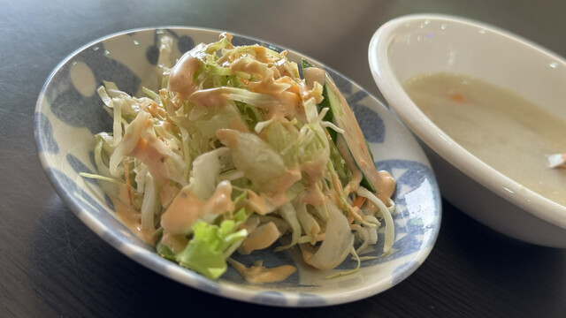 ずっと変わらないスープとサラダ。サウザンアイランドの掛かったキャベツとレタスとキュウリのシンプルなサラダ。これがかなり好き^_^