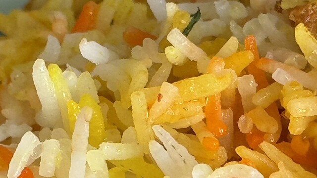 ピリヤニのポップ感は、粘り気が無く細長いインディカ米の軽やかさと、色の付いてない白いご飯で支えられている。これがいわゆるサフランライスみたいに全面真っ黄色ではいけない。山盛りライスのあちこちで味が違うのも重要。