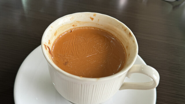 〆はホットチャイ。今回はちゃんとホットで来た。香辛料の香りが立つし、表面に牛乳が膜を作ったのを食べるのも、ホットならではの楽しみだ。