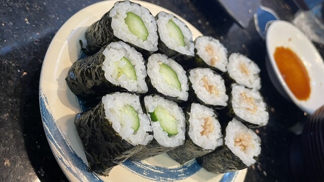 座ってすぐに巻物を発注してからえらく時間が過ぎ、発注し忘れたかと思った。しかしやがて出て来た細巻きはかつて見たことのないふんわりした巻き具合で、かつキュウリの香りが立っていた。