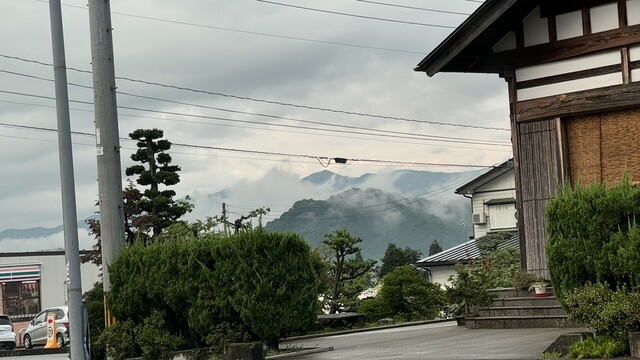 心細いアウェイ感は景色に対する感受性をブーストする。なだらかに下り続ける17号の右手に重なる緑の山並みのグラデーションに低くたなびく白い雲が美しく、ちゃんと停まって観ようと南魚沼まで来てようやくセブンに入り一服していると東の空に虹(╹O╹)。振り返って見ると国道を挟んだ先に雪国風の佇まいの建物。屋根に痛みが目立つけど現役の飲食店らしい。