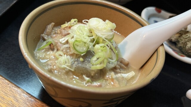 おかみさん担当?のもつ煮込みは見た目に煮込まれてる感じが無くなんだかなと思って食べてみたら、豚臭さがまるで無く、優しく深い味がした。サザエの壺焼きと同じ技術を感じた