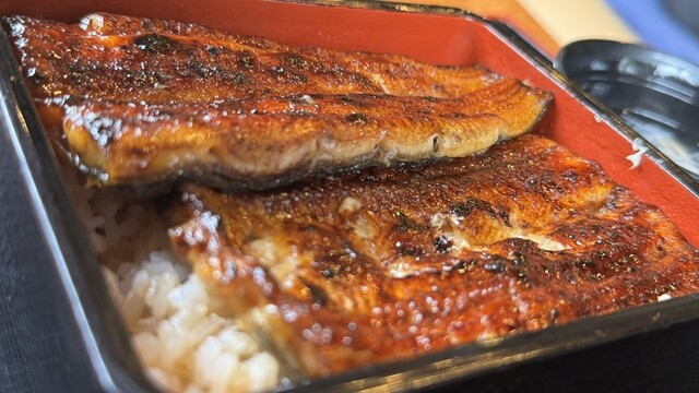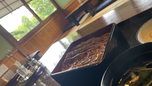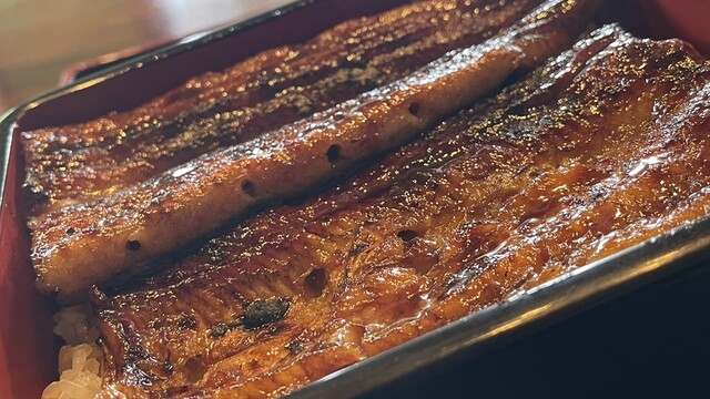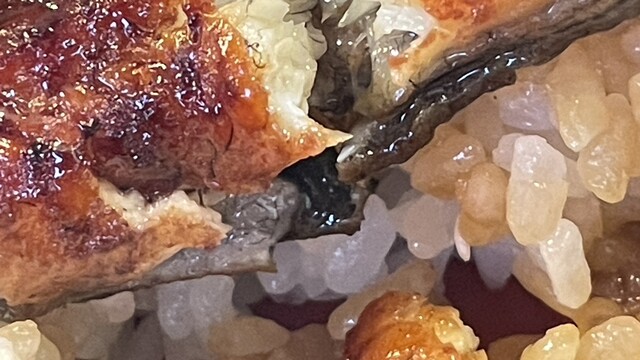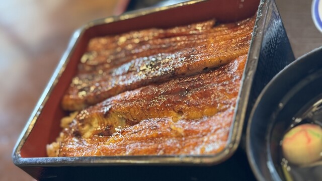 曇天の日の自然照明は食べ物のディテールを浮かび上がらせる。スマホのカメラはそれを捉えきれないのか、肉眼で見ると食品サンプルのように不自然な照りを見せる蒲焼きを、上品な金粉細工のように加工して写しとる^_^