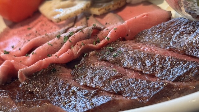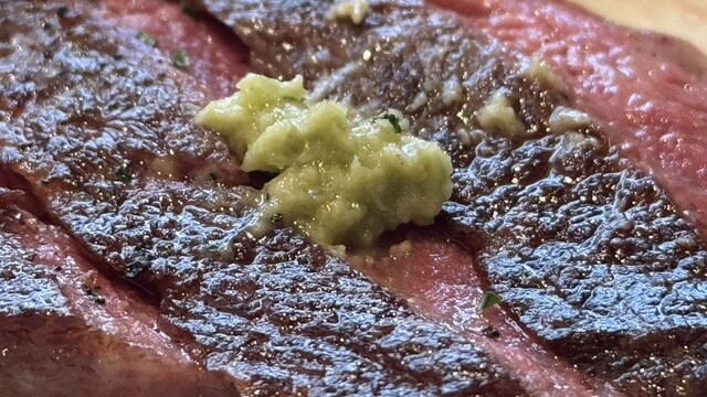パリパリに焼けた表面と鮮やかに血の気を滲ませたジューシーな中の肉のステーキ。自宅や焼肉屋で自分で焼いたのではこうは出来ない