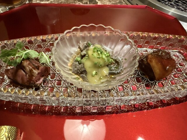 前菜盛り合わせは、牛の角煮とせんまい刺しとレバーの燻製でした。