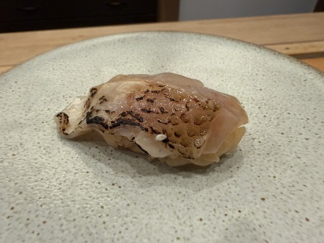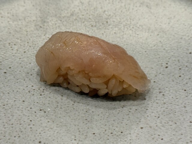 続く鮨三貫は、とらふぐの熟成握りから始まり、一週間寝かせた身の凝縮した旨味に、辛味が奥行きを与えていました。
