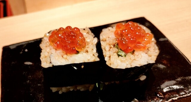 食べてみると中に、うずらの卵黄漬けが入っておりイクラの弾けた旨味と卵黄のコクの足し算が凄すぎる。卵×卵だけでは無く中には鰤、マグロ等の魚や薬味も色々入っており海鮮×卵の旨味爆弾巻きでした。率直に最高でした。