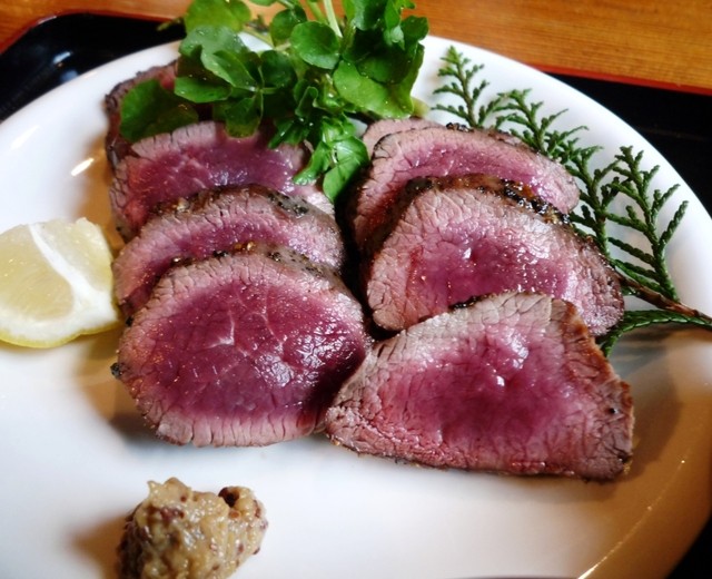 「牛たたき」風に周囲だけ火を通した鹿肉。粒マスタードを添えて。