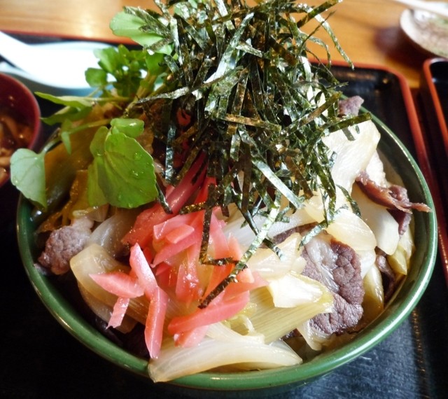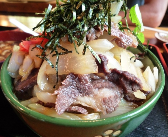 かなりのボリューム。たっぷりの玉ねぎと一緒に、甘辛醤油味の炒めた熊肉が載っています。