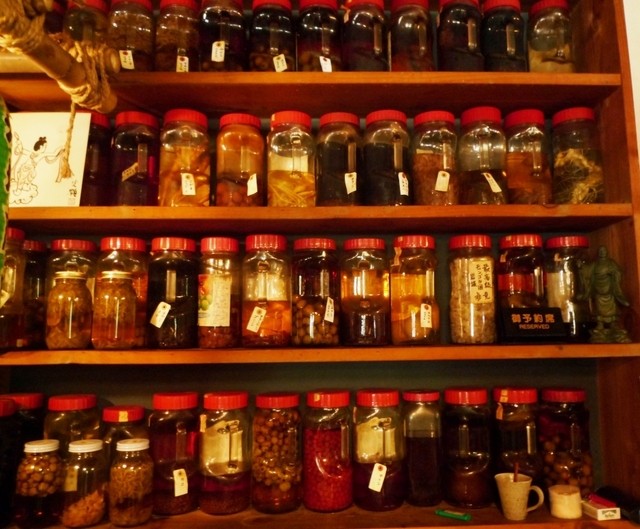 壁にはずらりと果実酒、薬草酒が。
